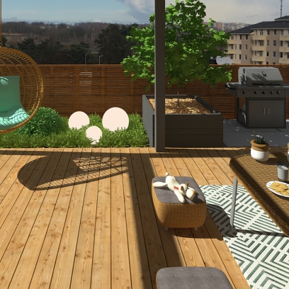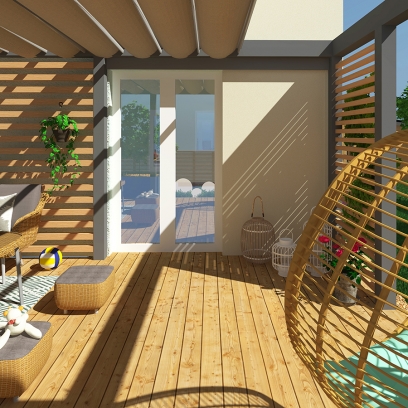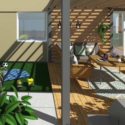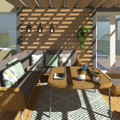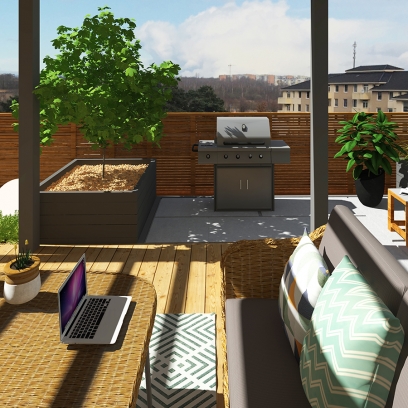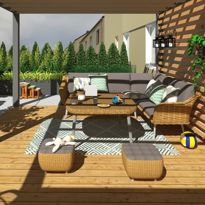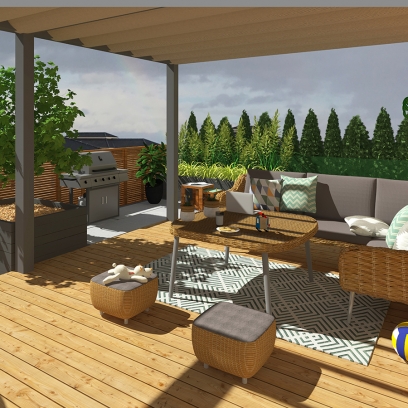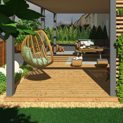 główne elementy:taras z pergolą, miejsce na fotel/kokon, nawierzchnia z płyt ceramicznych z miejscem na grilla, trawnik, drewniane płotki