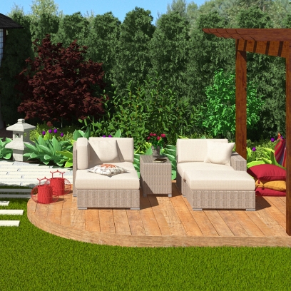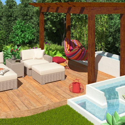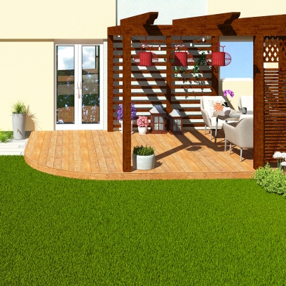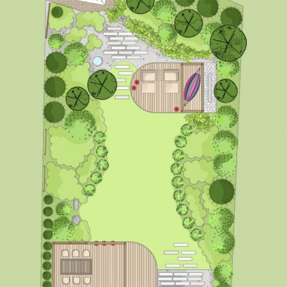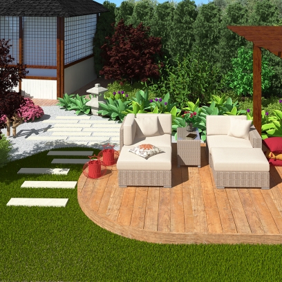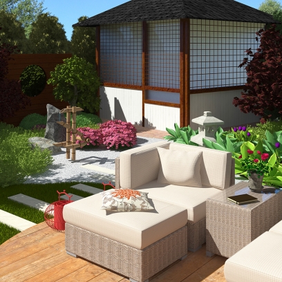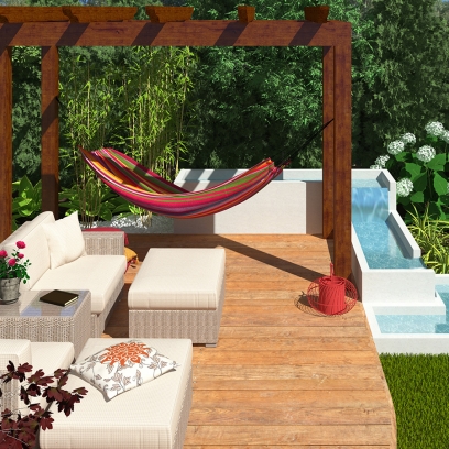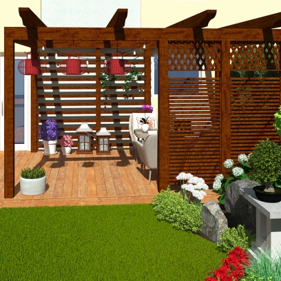 główne elementy:przearanżowanie istniejącego ogrodu, ogród z akcentami w stylu japońskim, tarasy z pergolami, miejsce na hamak, element wodny