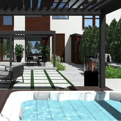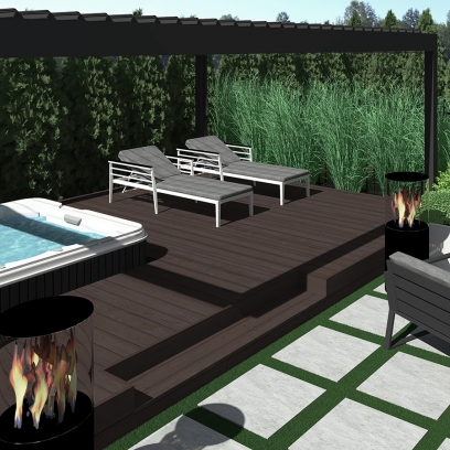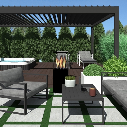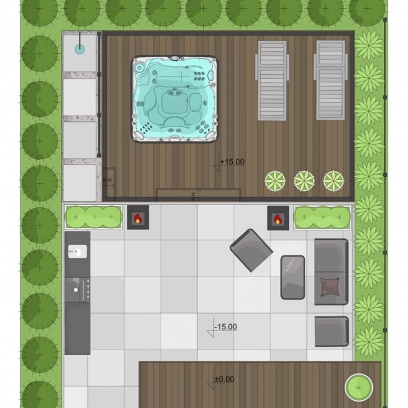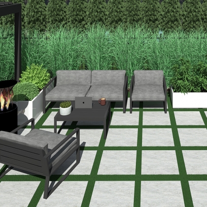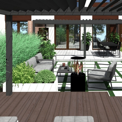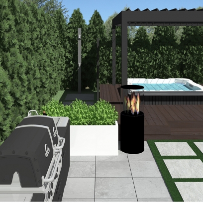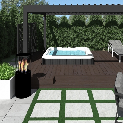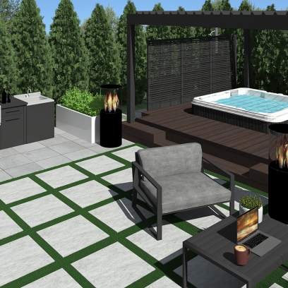 główne elementy:duże tarasy z płyt ceramicznych i drewna bambusowego, nawierzchnia z płyt pomiędzy trawą, grill zewnętrzny i pergole z wanną spa
