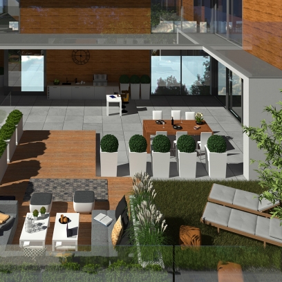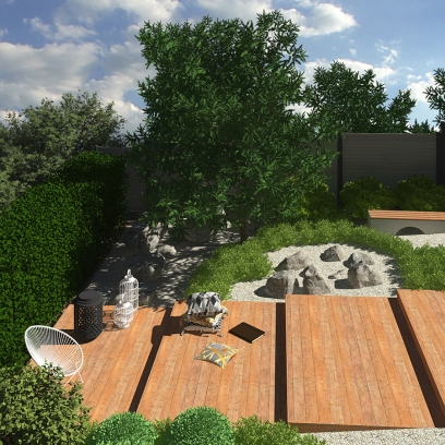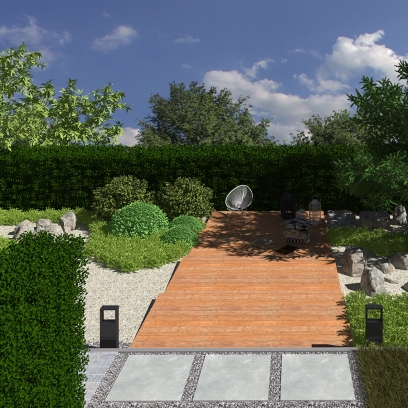 główne elementy:obszerny taras z zewnętrzną kuchnią i mebami wypoczynkowymi, ogród japoński