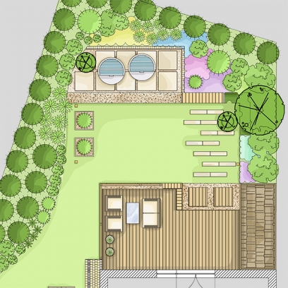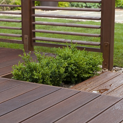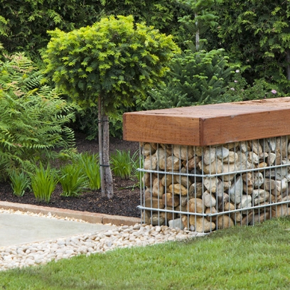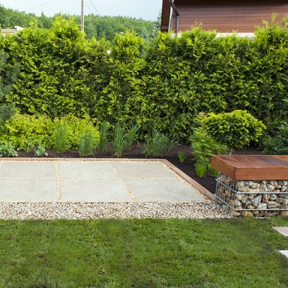 główne elementy:drewniany taras, żaluzjowe ogrodzenie, gabion z bursztynowymi kamieniami, jasne płyty, "rzeka" z otoczaków
