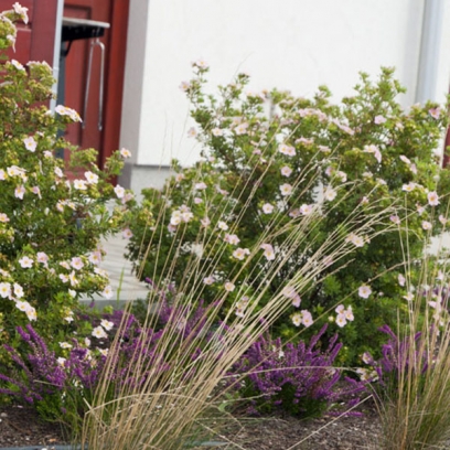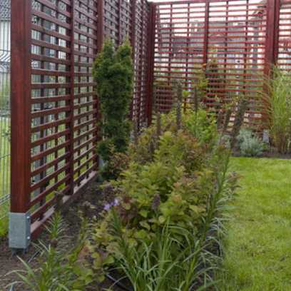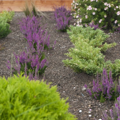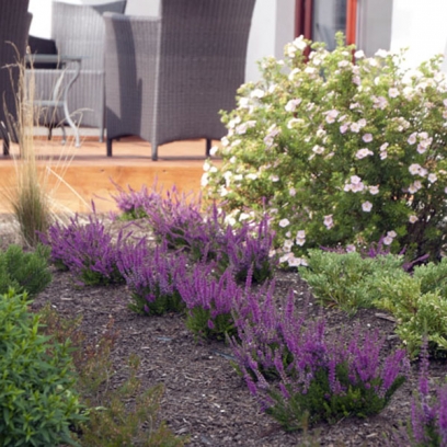 główne elementy:skarpa z wrzosami, miejsce do siedzenia z ławką na żwirowej nawierzchni, drewniane płotki